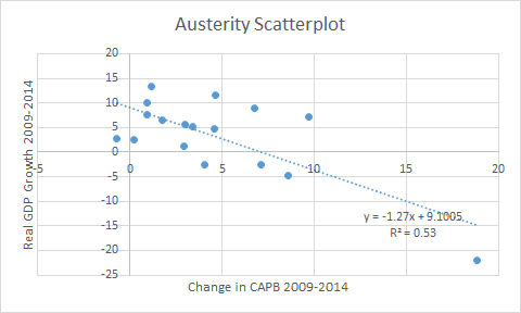 I composed one list that included the Euro Area and one that did not (only to make Sumner shut up) and ran a regression taking the change in the CAPB between 2009 and 2014 as the x variable and the growth of real GDP between 2009 and 2014 as the y variable. The first list included Austria, Belgium, Canada, the Czech Republic, Germany, Denmark, Spain, Finland, France, Greece, Ireland, Italy, Japan, the Netherlands, Portugal, the United States, and the United Kingdom while the second list only had the Czech Republic, Japan, the United States, and the United Kingdom. Note that all of the countries were either at the zero lower bound or otherwise in a liquidity trap (defined as a case in which lowering the nominal interest rate to zero could not have resulted in full employment).