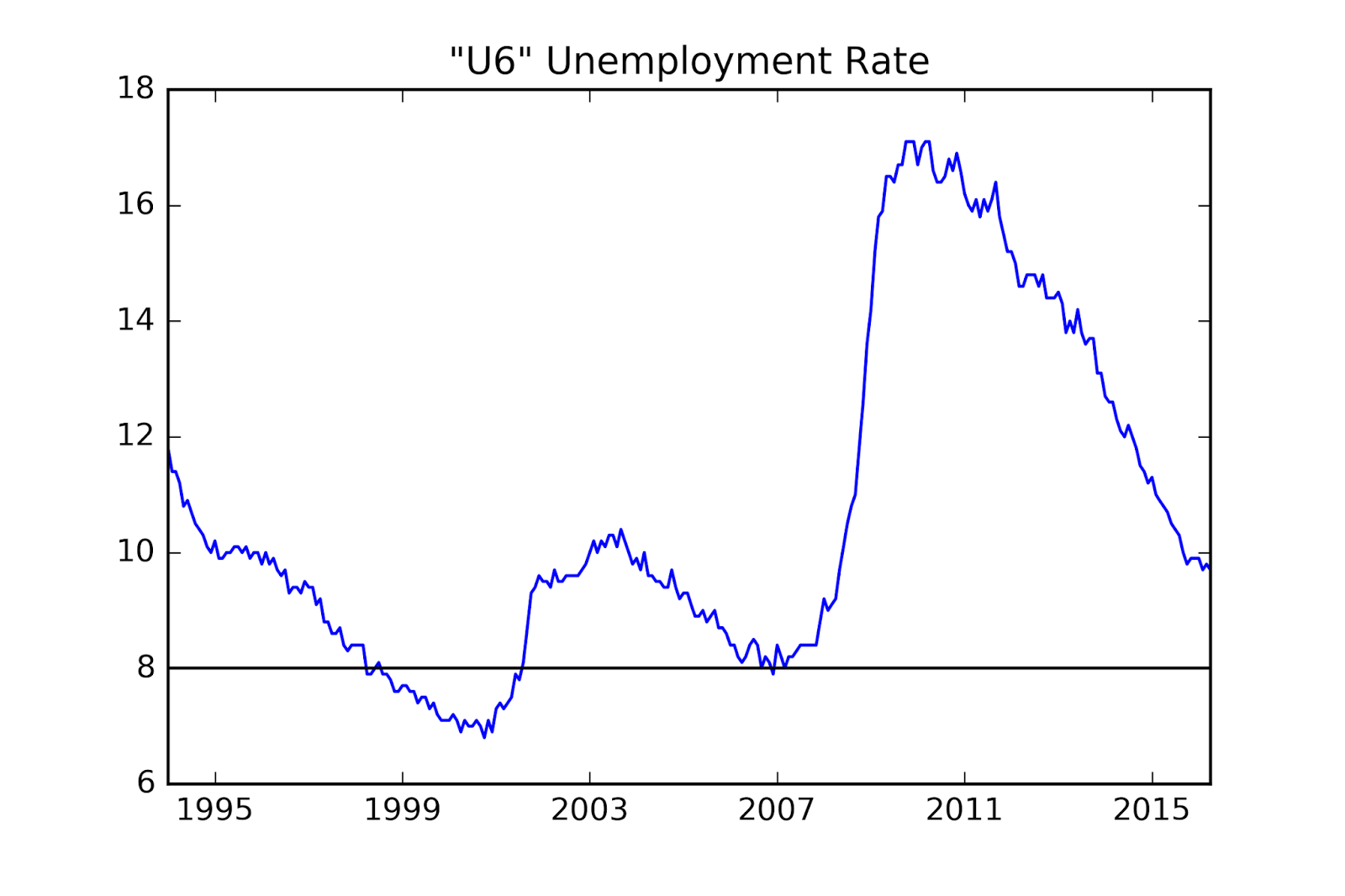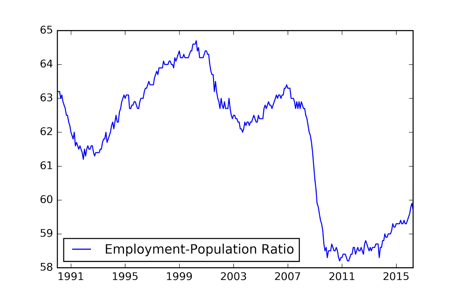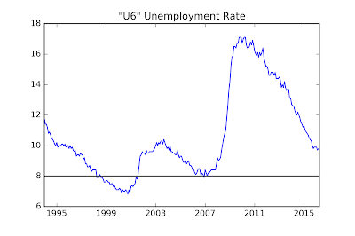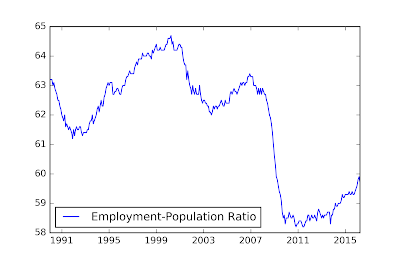 Since the NBER recession trough in June 2009, the employment to working age population ratio has recovered a lot more than the employment to population ratio, and this is with data that only goes until March of 2015. Also, broader measures of unemployment that include those 'marginally attached' to the labor force -- people who have expressed a desire for work in the last 12 months -- as well as people who are currently part time but would like to be full time show a much more robust recovery in employment than the employment to population ratio suggests.