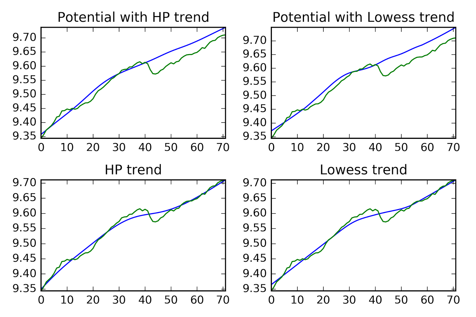 Since the shock term is still present, it is necessary to smooth the data again. I used an HP filter for both this as the previous smoothing (discerning potential GDP), but you can also use a lowess/LOESS filter, if you prefer, the results are not different enough to be worthwhile, although sometimes the lowess result seems more plausible when eyeballing.