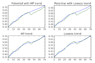 I digress, this new filtered series should provide a plausible estimate of potential GDP somewhat like this: