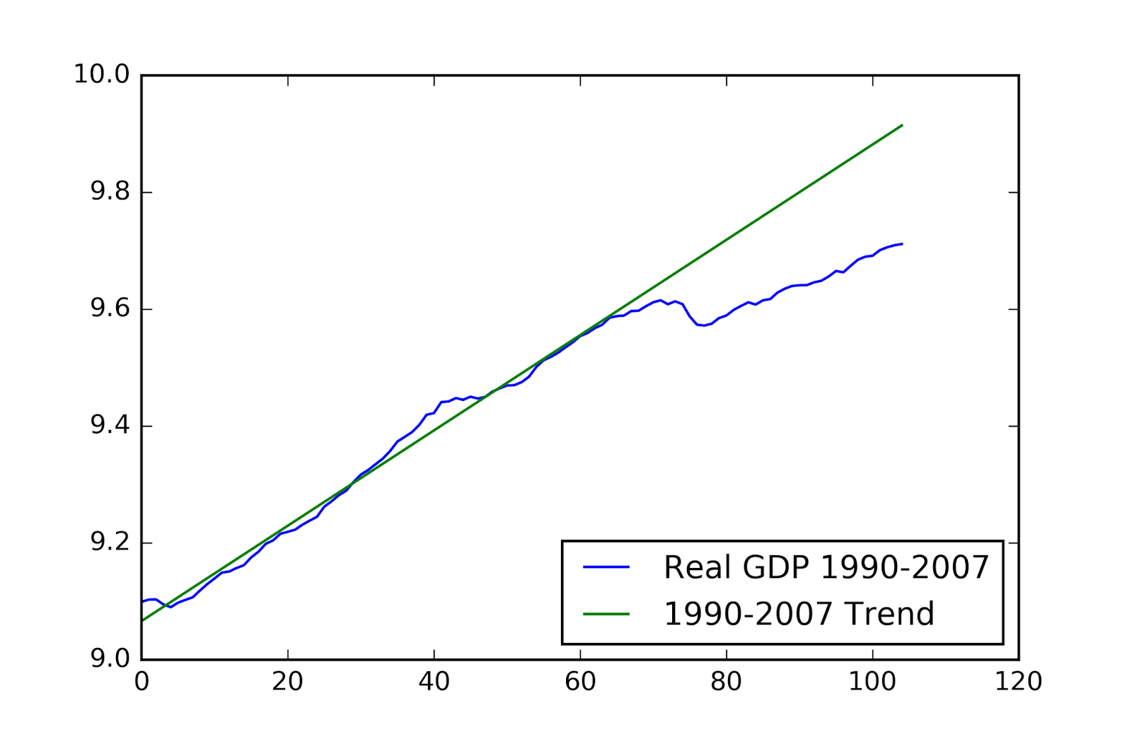 I'm still not perfectly happy with this assessment because I wanted to use the real GDP to working age population ratio instead of simply real GDP, as it would have made the intercept for the regression a little bit less uncertain -- while steady state real GDP growth is indeed quite variable, adjusting for demographics seems to solve the problem most of the time. Unfortunately FRED has annoying limitations with graphs and data lists, so this is the best I could do without spending more than a day on this.
