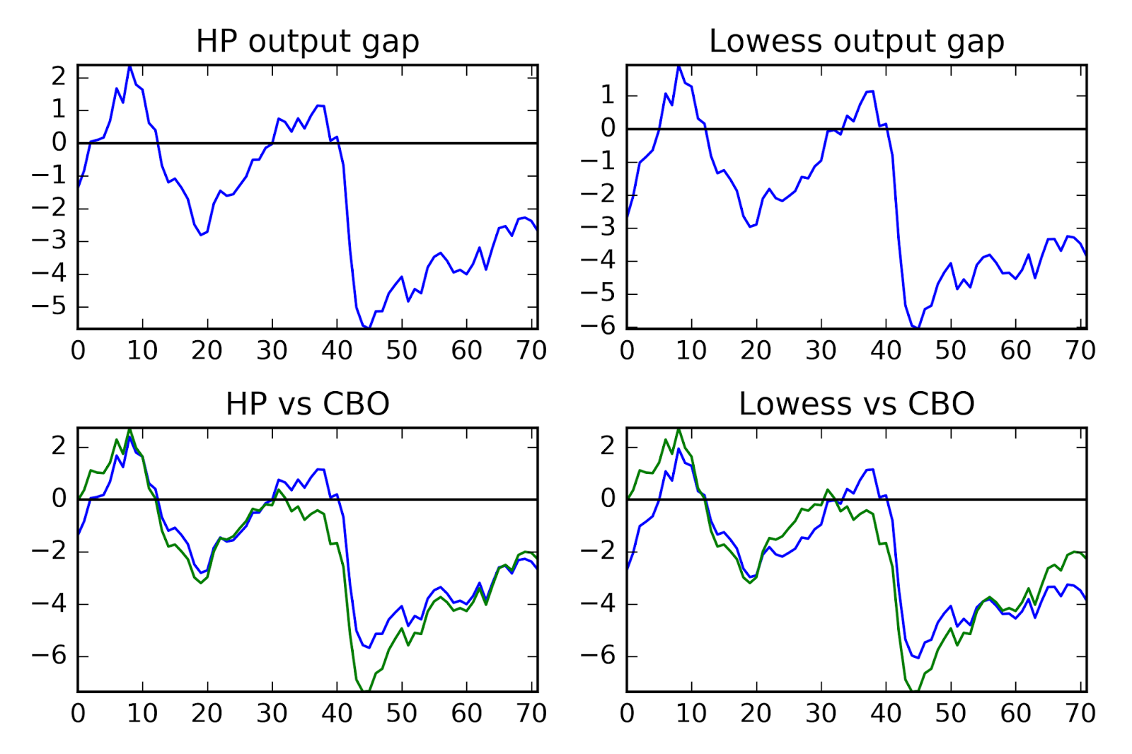 Also, here is a comparison of my estimate of the US output gap and that of the CBO, as well as a comparison of the same data using an HP filter and a lowess filter: