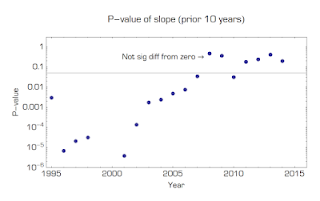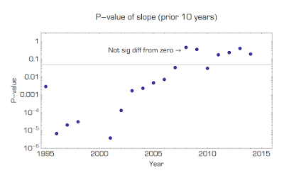 But I thought I would do some of my own calculations, so I took the same data I was using before, except now expressed as a change from twelve months ago, and found the slope and p-values over the prior five years for each year between 1992 and 2015. The results were a little different than Jason's (which is understandable given the shorter time horizon):